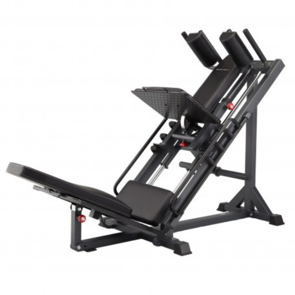 • Leg press back pad : features lumbar support and flips up on a hinge for hack squat.