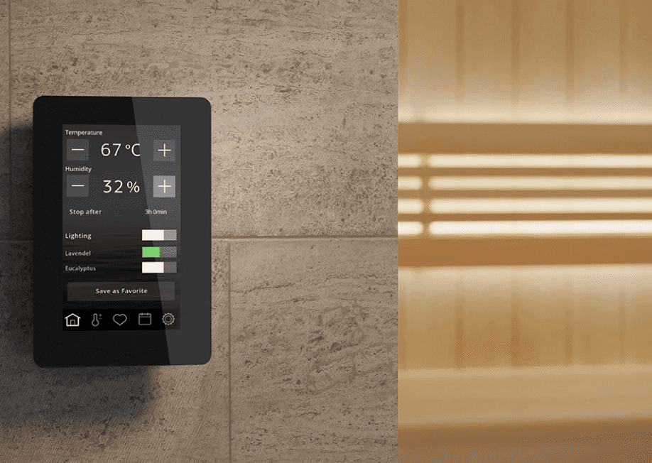 The new control panel Elite Free has now been updated with cloud-based functionality that allows you to control your sauna from anywhere, anytime. The multi-disciplinary Elite Free control panel is for saunas or steam rooms and it is packed with advanced features, thanks to its internal processor and operating system. In addition to highly personalized settings, the Elite Free can be individually programmed according to your own schedule. Add features such as auxiliary fans, fragrance pumps or lights – the Elite Free control panel handles it all with clear and concise precision. The 4.5-inch touch screen delivers real-time status on every aspect of your sauna and steam bath. It includes energy saving functions.